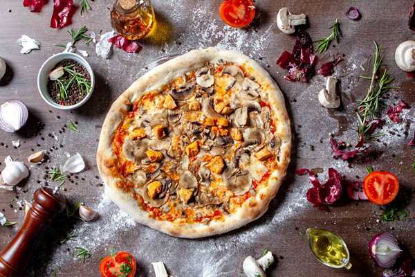 O pizza delicioasă acoperită cu sos de roșii, mozzarella, bucăți de piept de pui și ciuperci proaspete. Această combinație simplă, dar savuroasă, este perfectă pentru cineva care dorește să-și satisfacă pofta de pizza cu topping-uri mai sănătoase și mai ușoare.